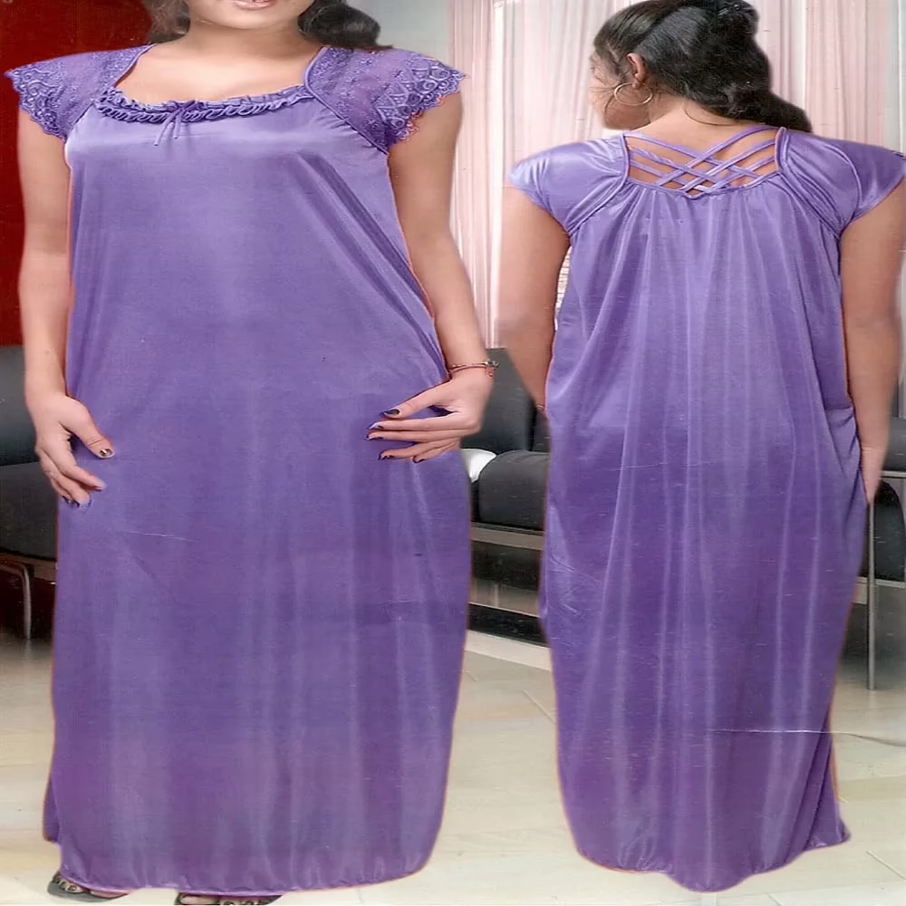Light Purple Satin Lace Full Length Nightgown from Seasonsway.com makes comfortable and relaxed when you go to bed featuring attractive designer Scoop Neck with criss cross designs on back,plain,light purple in colour,satin fabric, short sleeves with sheer lace threadwork.