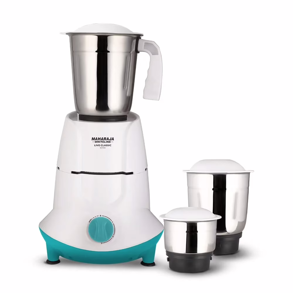 Maharaja Whiteline Livo Classic MX-250 500 W Mixer Grinder (3 Jars, White & Turquoise Blue).