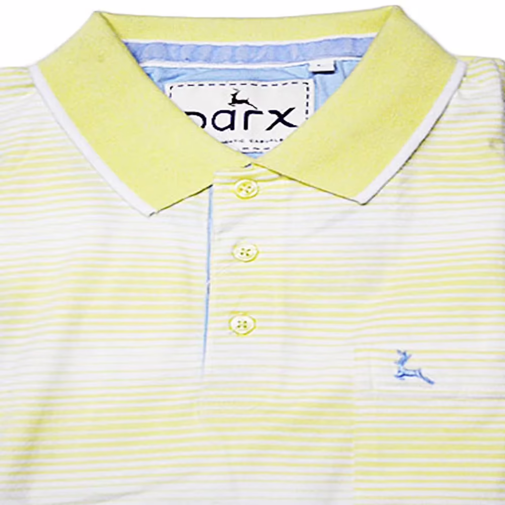 Parx Authentic Casuals T-Shirt Features tipped collar neckline,lemon white stripes,authentic brand patch on front left,triple buttoned front,half sleeves,mesh detail and made from 100% cotton fabric keeping you comfortable,sweat-free and fresh.