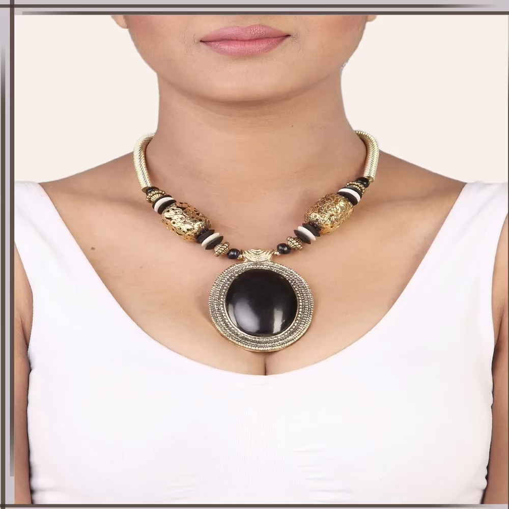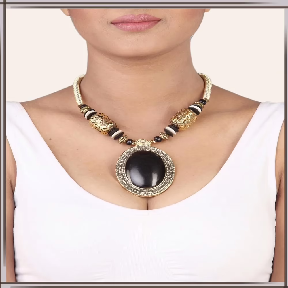 Mango Pendant and Earring sets Features:Golden and Black metal festival necklace intricate with beads, metal work, patch style and circular style