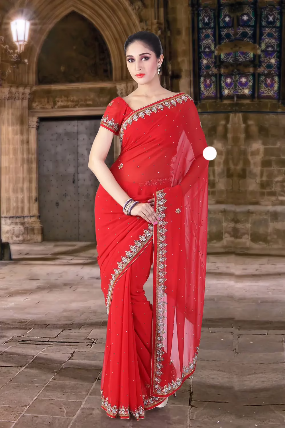 Saree Features: Rose-madder Red embroidered party saree intricate with zari thread, sequins work, stone, floral work, beads work, leaf work and border work.Saree comes with an unstitch blouse piece which can be customised as per your requirement. Customisation includes changing front neck style, back neck style, increasing/reducing the length of sleeves.
