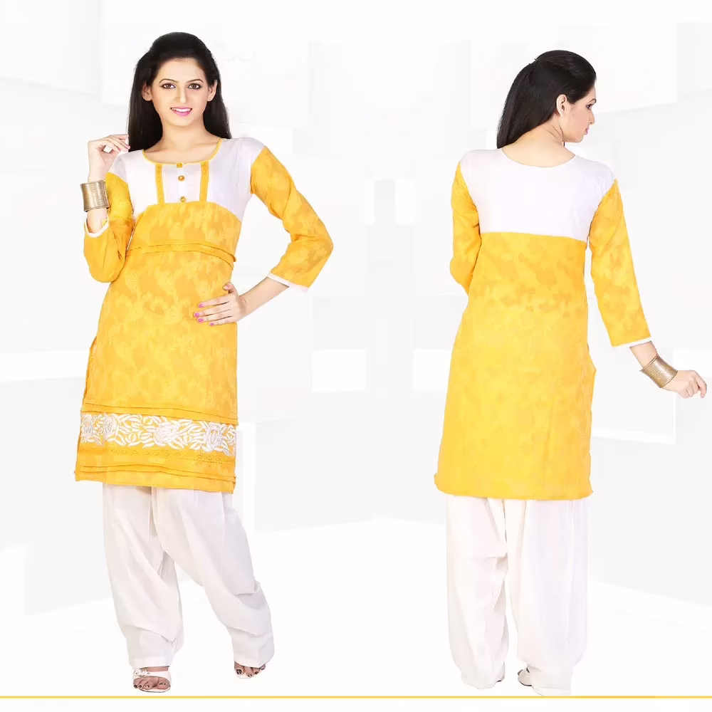 Suit Features –Saffron Yellow embroidered party kurti intricate with resham thread, floral work, leaf work, floral print, keri print and border work. This kurti is readymade and is available upto chest size 42.There might be some color variation.