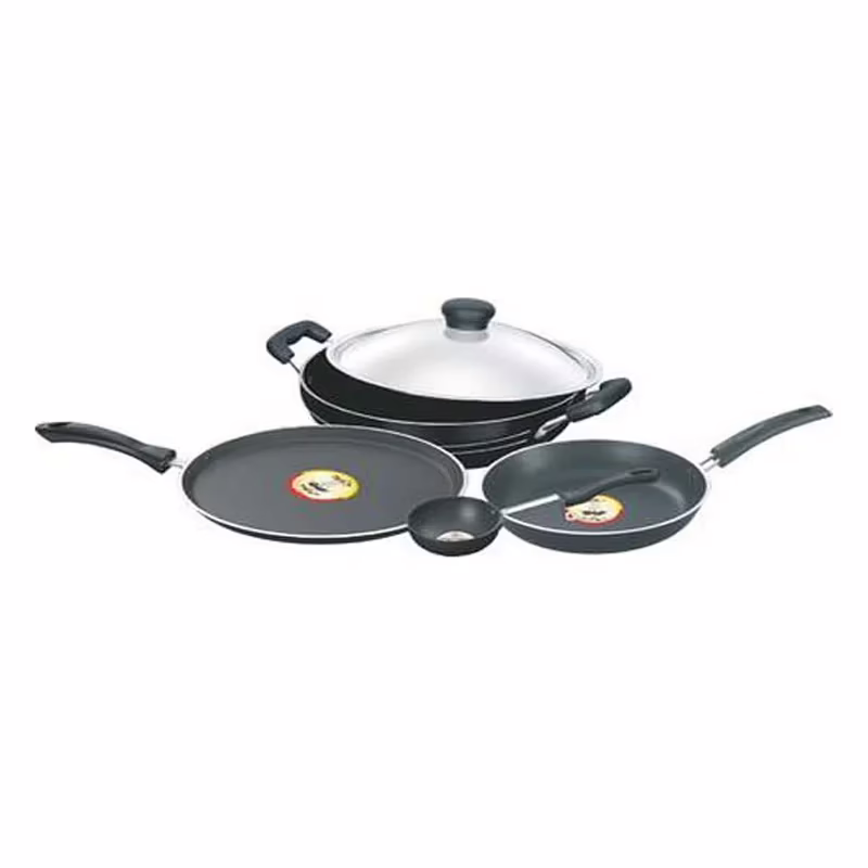 Pigeon 5 Pcs Gift Set – Emerald (tadka Pan, Fry Pan, Tawa, Kadhai With Stainless Steel Lid) has a thick body with induction base, which is compatible on any induction cooktop.Has a spiral bottom for even heating. It is metal spoon friendly and comes with strong, sturdy, stay-cool bakelite handles. Its save your time and money serves you the tast food withou any hussle.