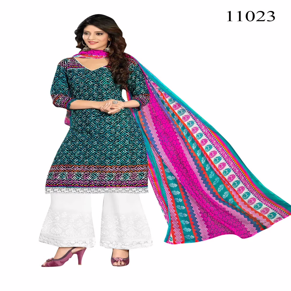 A splash of Green colours is thisprinted coloured suit set from V&D, owing to the ikat print and Lace Border on the kurta. The suit set comprises a printed kurta, with an White Palazzo and Printed dupatta. V neckline with 3/4 sleeves gives a chic look to the kurta of this set. The 100% Cotton fabric construction makes this suit set light and highly comfortable. This kurta can be teamed with minimal jewellery and ethnic footwear.