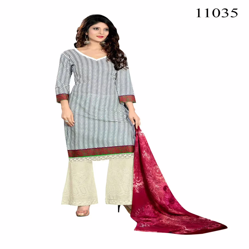 A splash of Greynbsp;colours is thisprinted coloured suit set from V&D, owing to the ikat print and Lace Border on the kurta. The suit set comprises a printed kurta, with an White Palazzo and Printed dupatta. Beautiful neckline with 3/4 sleeves gives a chic look to the kurta of this set. The 100% Cotton fabric construction makes this suit set light and highly comfortable. This kurta can be teamed with minimal jewellery and ethnic footwear.