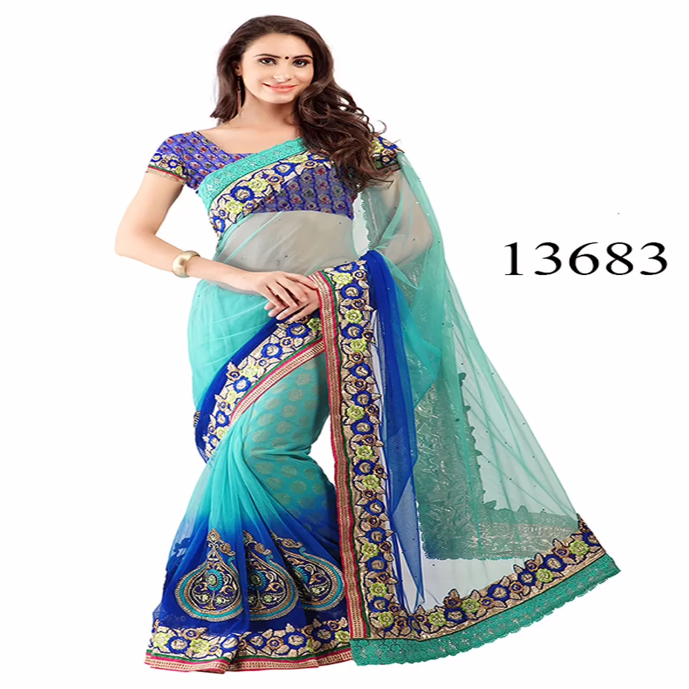 This Viva N Diva Rama & Blue Colored Net & Viscose Saree which keeps you fresh and comfortable all day. The one who are desperate about their outfit style trend can prefer this awesome collection this attire gives you satisfaction as it adjoins the exclusive structure to your outfit.