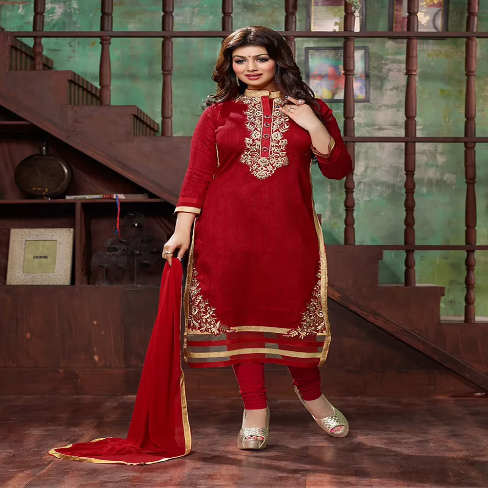A splash of Red colours is thisprinted coloured suit set from V&D, owing to the ikat print and Golden Border on the kurta. The suit set comprises a printed kurta, with an Red salwar and Najneen dupatta. Collar neckline with 3/4 sleeves gives a chic look to the kurta of this set. The 100% Bhagalpuri fabric construction makes this suit set light and highly comfortable. This kurta can be teamed with minimal jewellery and ethnic footwear.