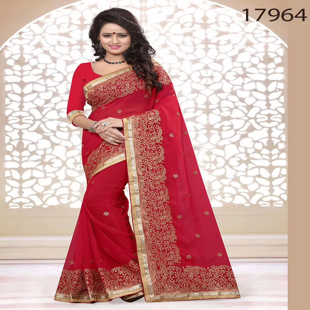 This Viva N Diva Red Colored Georgette Saree which keeps you fresh and comfortable all day. The one who are desperate about their outfit style trend can prefer this awesome collection this attire gives you satisfaction as it adjoins the exclusive structure to your outfit.